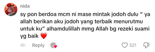 Menjengah ke ruangan komen, rata-rata netizen dilihat turut mengamalkan doa yang sama dan bersyukur dikurniakan suami yang dapat membimbing mereka. Selain itu, warganet turut mendoakan pasangan ini berkekalan hingga ke akhirnya.