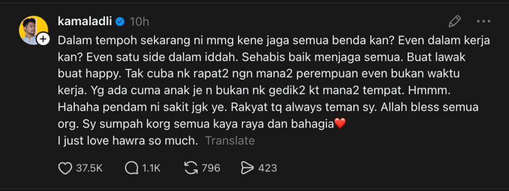 “Rakyat, tq (terima kasih) always (selalu) teman saya. Allah bless (rahmati) semua orang. Saya sumpah korang semua kaya raya dan bahagia. I just love Hawra so much, (saya sangat sayangkan Hawra),” kongsinya.