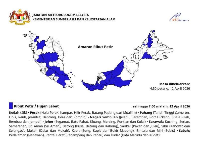 Jabatan Meteorologi Malaysia (MetMalaysia) mengeluarkan amaran ribut petir, hujan lebat dan angin kencang yang dijangka meliputi tujuh negeri hingga 7 malam ini.
